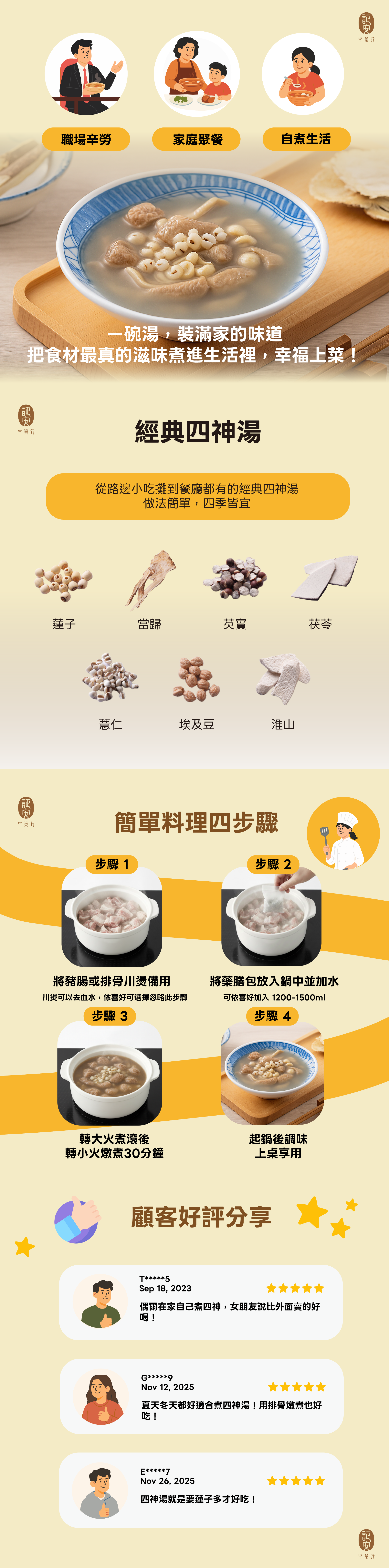 成分:蓮子、芡實、茯苓、薏仁、埃及豆、當歸、淮山